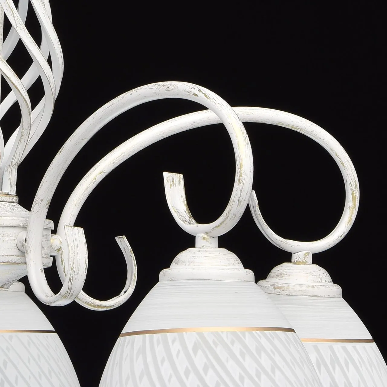 Металлическое основание, окрашенное в белый цвет с золотистой патиной . Плафоны из стекла, отлитого